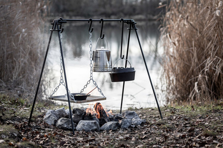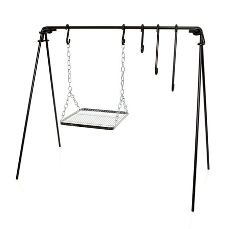 - Duży stalowy bardzo solidny i stabilny stelaż do gotowania nad ogniskiem. Kilka funkcji jednocześnie: wiszący ruszt i haki na garnki. Składany i bezpieczny. Wysokość po złożeniu: 110 cm. Waga: 16 kg, obciążenie do 70kg. Dostępny teraz na Foodlovers.pl.