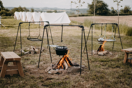Dzięki konstrukcji z oczkami stelaż stoi pewnie na czterech nogach i jest błyskawicznie gotowy do użycia. Dzięki poprzeczce o długości 115 cm możesz ustawić swoją kuchnię biwakową nad jednym lub kilkoma paleniskami. Na trzech hakach o różnej długości można zawiesić nad ogniem naczynia na różnych wysokościach. W ten sposób można regulować temperaturę gotowania potraw w trzech stopniach.