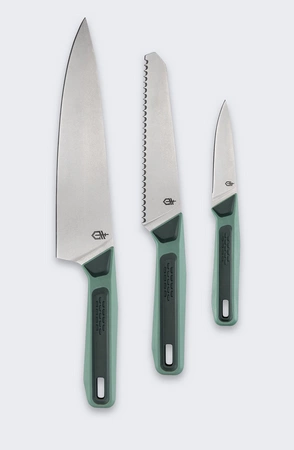 - Zestaw noży kempingowych Gerber ComplEAT to doskonały wybór dla miłośników outdooru. Trzy niezbędne noże: nóż do obierania o długości 8,25 cm, ząbkowany nóż użytkowy o długości 15,24 cm, oraz nóż szefa kuchni o długości 20,32 cm.